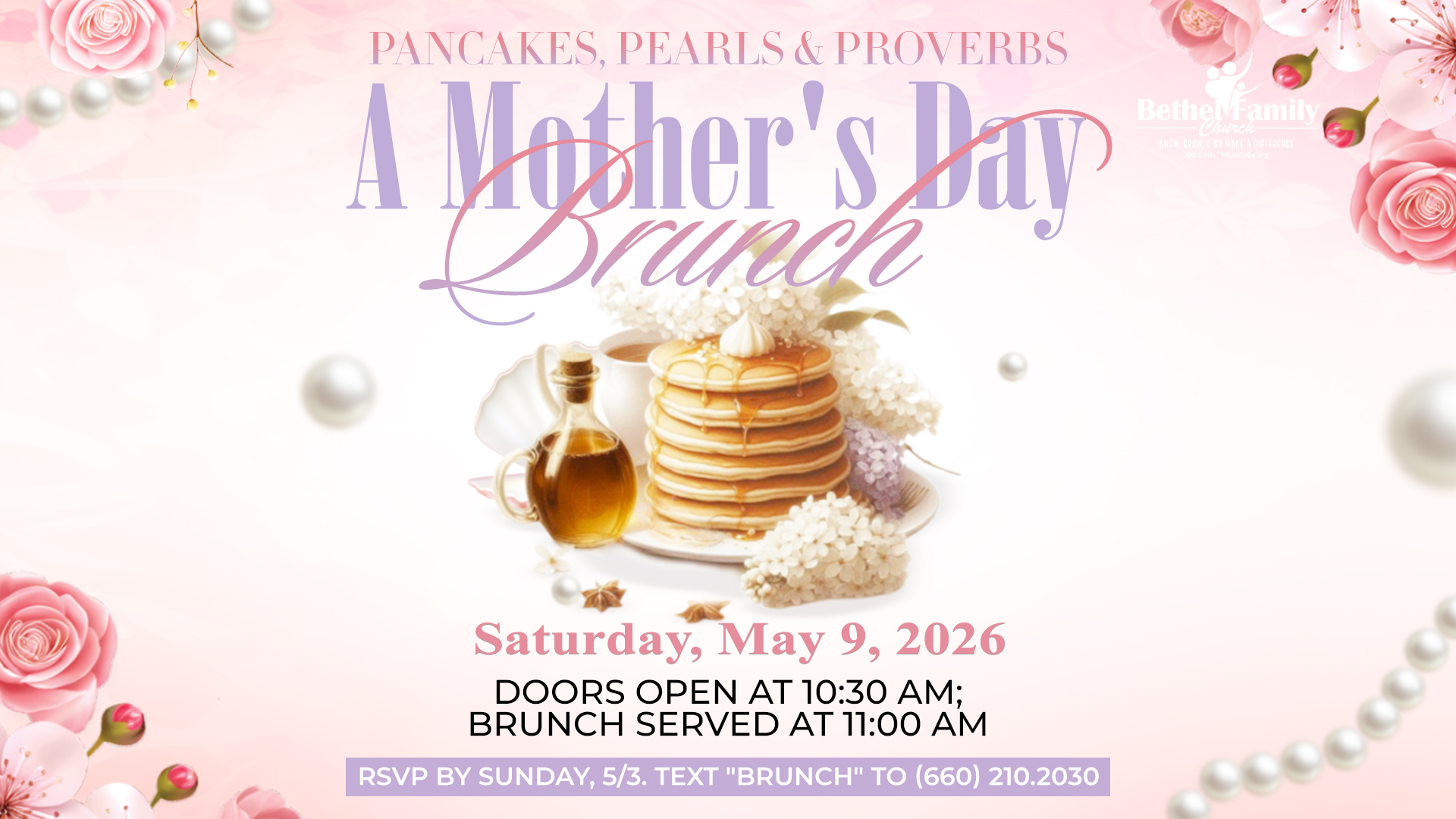 Celebrate the beauty, strength, and wisdom of motherhood at Bethel Family Church’s special Mother’s Day Brunch, “Pancakes, Pearls & Proverbs.” Join us on Saturday, May 9, 2026, for a meaningful time of fellowship, encouragement, and honor as we gather to uplift the incredible women in our lives. Doors open at 10:30 AM, with a delicious brunch served at 11:00 AM, creating the perfect setting for connection, laughter, and inspiration rooted in God’s Word. Whether you are a mother, grandmother, mentor, or simply want to celebrate the women who have made an impact in your life, this event promises to be a memorable and heartwarming experience. Be sure to reserve your spot and come ready to enjoy a beautiful celebration of faith, family, and love.