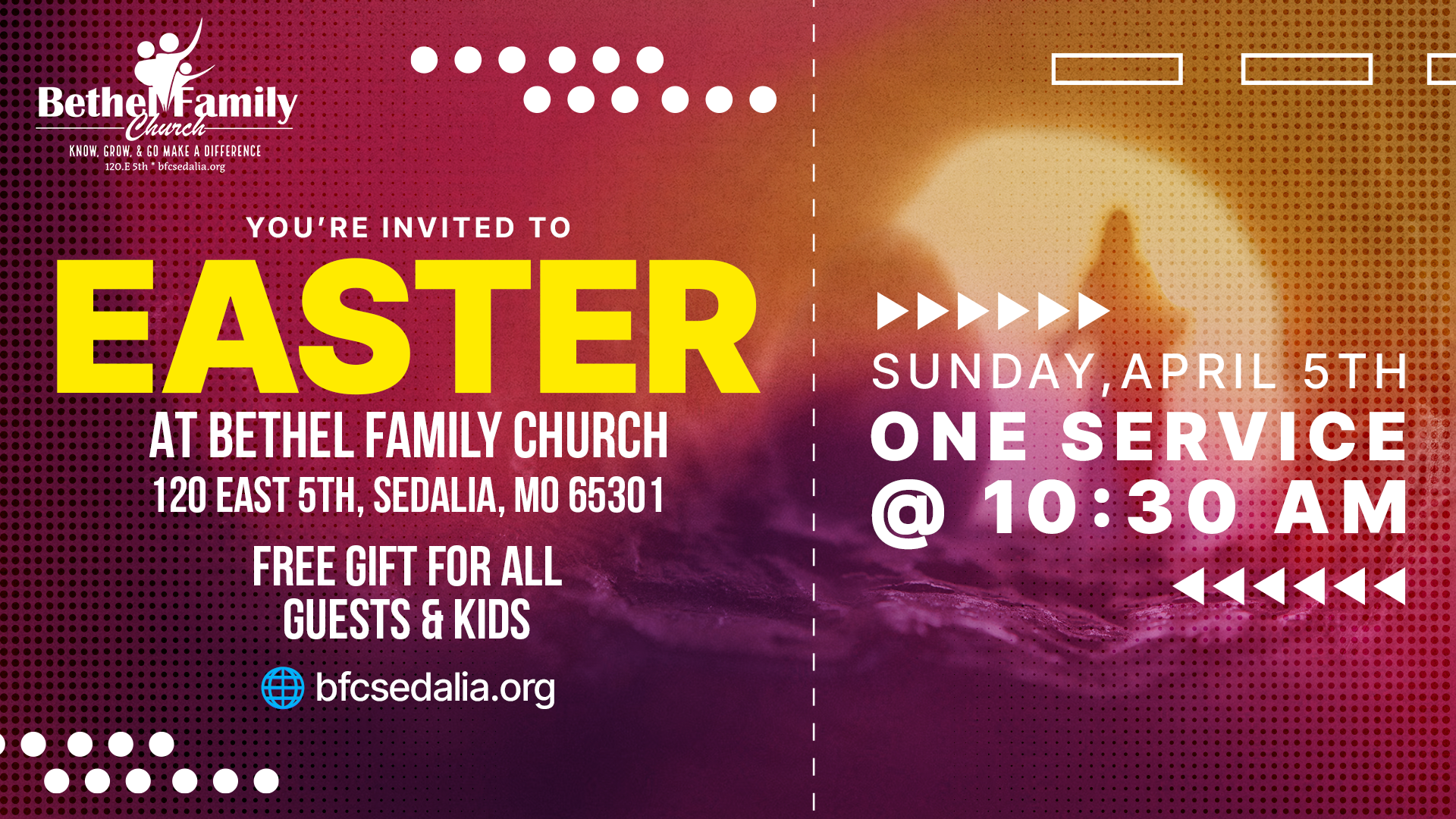 Celebrate the hope and victory of Easter with us at Bethel Family Church on Sunday, April 5th at 10:30 AM for one powerful, unified service. This special gathering is designed for the whole family, with uplifting worship, an encouraging message, and a welcoming atmosphere where everyone belongs. Whether you’ve been part of church for years or are simply looking for a place to experience the meaning of Easter, you are invited to join us at 120 East 5th Street in Sedalia. We are excited to welcome you and are offering a free gift for all guests and kids as our way of saying thank you for celebrating with us.