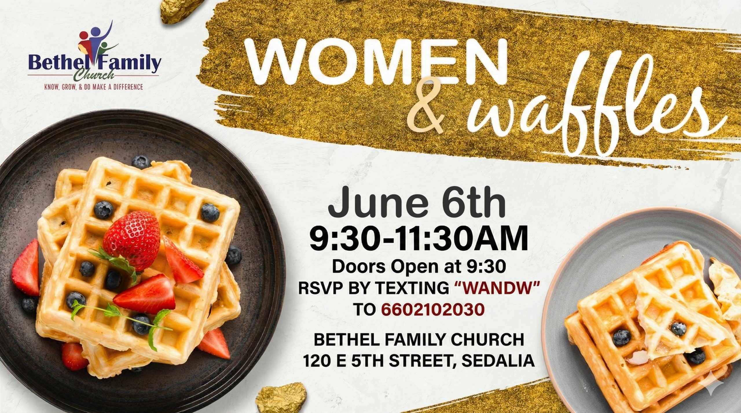 Bethel Family Church invites you to join us for Women & Waffles on June 6th from 9:30–11:30AM for a warm and welcoming morning designed just for women. Doors open at 9:30AM as we gather for meaningful conversation, encouragement, and connection over a delicious waffle breakfast. This special event is an opportunity to build relationships, grow in faith, and be refreshed in a supportive and uplifting atmosphere. Whether you are new to Bethel Family Church or have been attending for years, Women & Waffles is the perfect space to connect and be inspired. RSVP by texting “WANDW” to 6602102030 and join us at 120 E 5th Street in Sedalia for a morning that will nourish both body and soul.