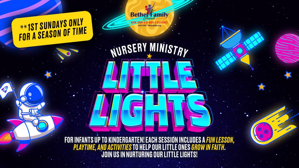 Bethel Family Church parents—bring your little ones to Little Lights Nursery Ministry (for infants through kindergarten) on 1st Sundays only (for a season). Each session includes a fun Bible lesson, playtime, and activities designed to help our kids grow in faith. Join us as we nurture our little lights! Introduce your youngest children to the grand story of Jesus and God’s love for everyone, packed with engaging storytelling, free play activities, fun crafts, and age-appropriate songs, the curriculum is designed to share Jesus through biblical stories laying the foundation of belief & faith in our youngest of children.